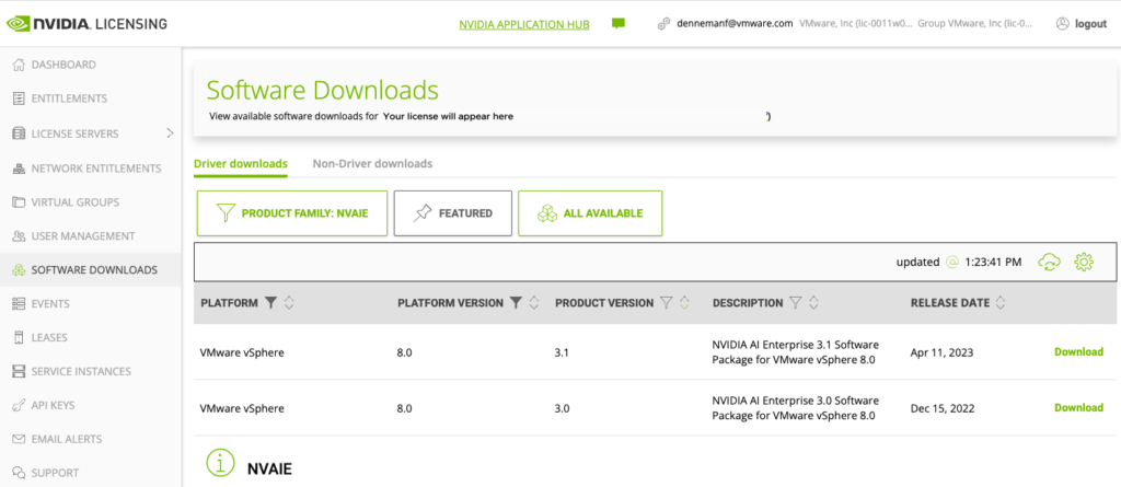 When using NVAIE, you need a vGPU software license, and the drivers used by the NVAIE suite are available at the NVIDIA enterprise software download portal. This source is only available to registered enterprise customers. The NVIDIA Application Hub portal offers all the software packages available. What is important to note, and the cause of many troubleshooting hours, is that NVIDIA provides two different kinds of vSphere Installation Bundles (VIBs).