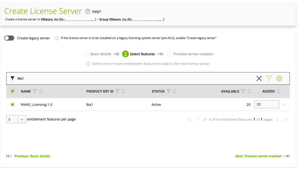 In the textbox in the ADDED column, enter the number of licenses for the product that you want to add. Click Next: Preview server creation.