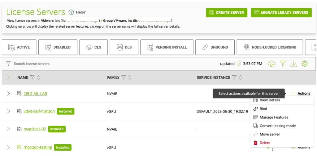 This step is necessary if you are using multiple CLS instances in your organization that is registered at NVIDIA and you are using the new CLS instance, not the default CLS instance for the organization. In the left navigation pane, expand LICENSE SERVER and click LIST SERVERS. Select your License Server, click on Actions, and choose Install.