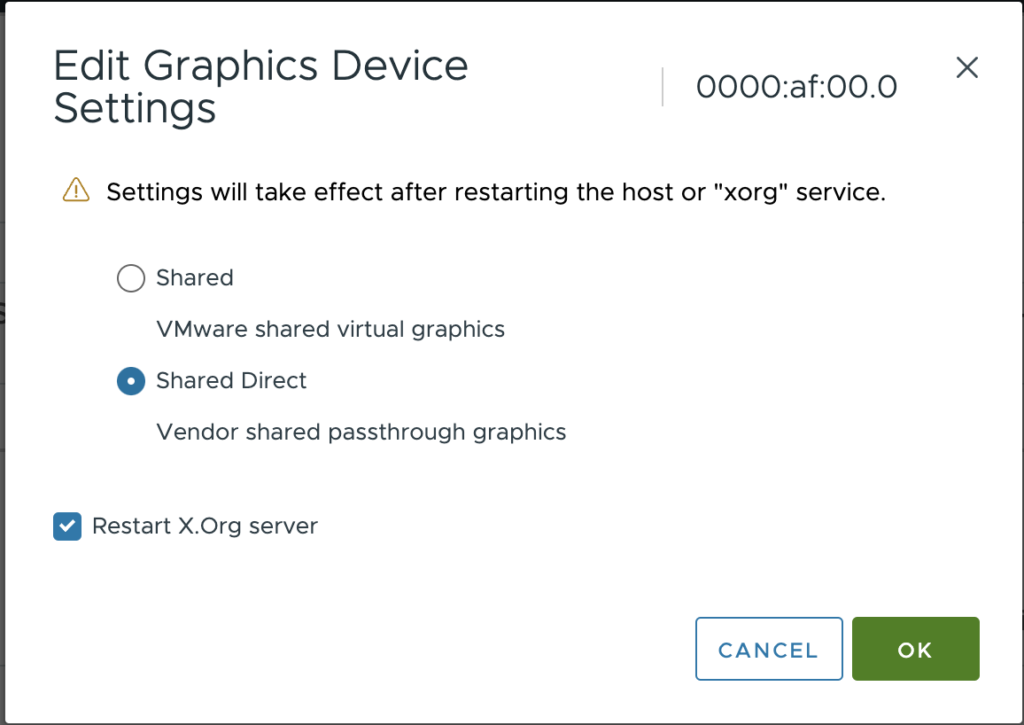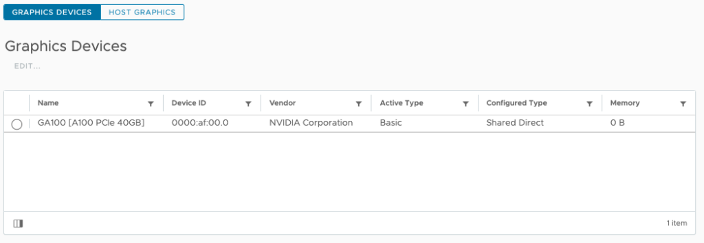 Select the GPU and choose EDIT... The default graphics type is Shared, which provides vSGA functionality. To enable vGPU support for VMs, you must change the default graphics type to Shared Direct.