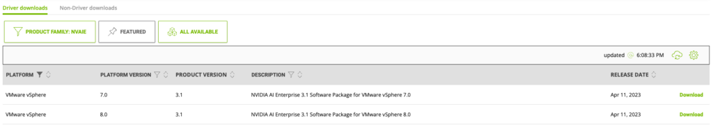 Select the latest release. At the time of writing this article, the latest NVAIE version was 3.1 for both vSphere 7 and vSphere 8.