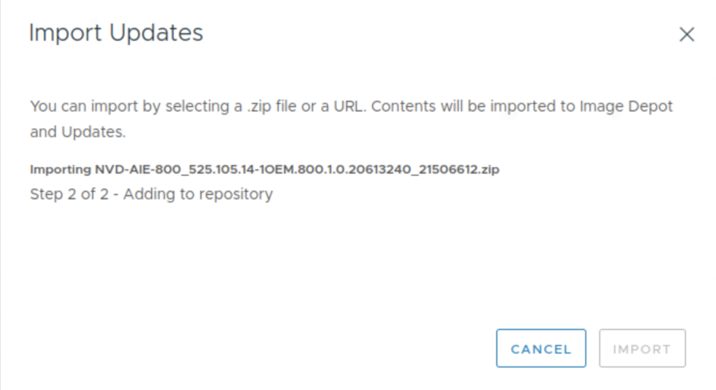 Browse to the download location of the NVAIE vGPU driver and select the Host Driver Zip file to IMPORT.